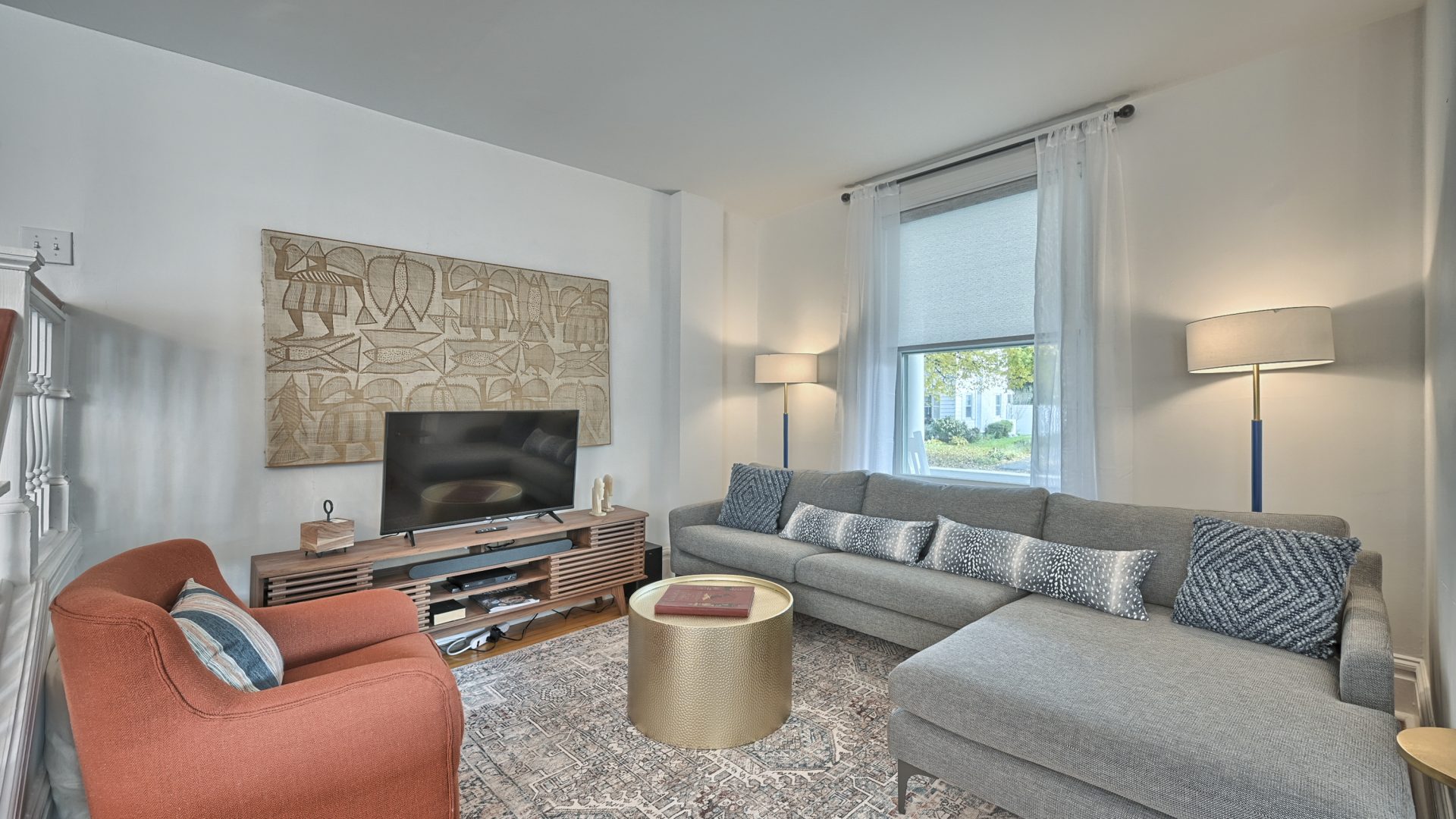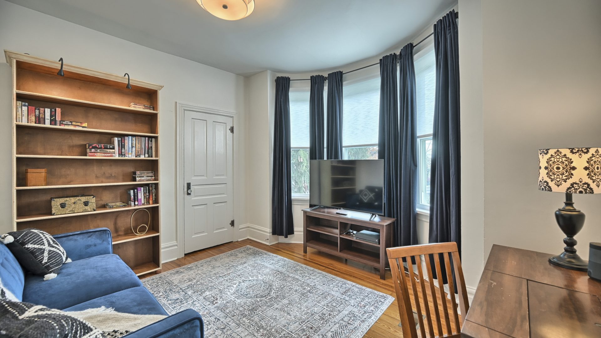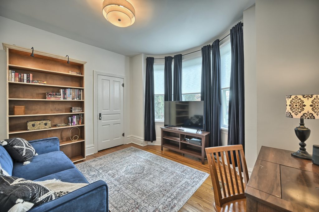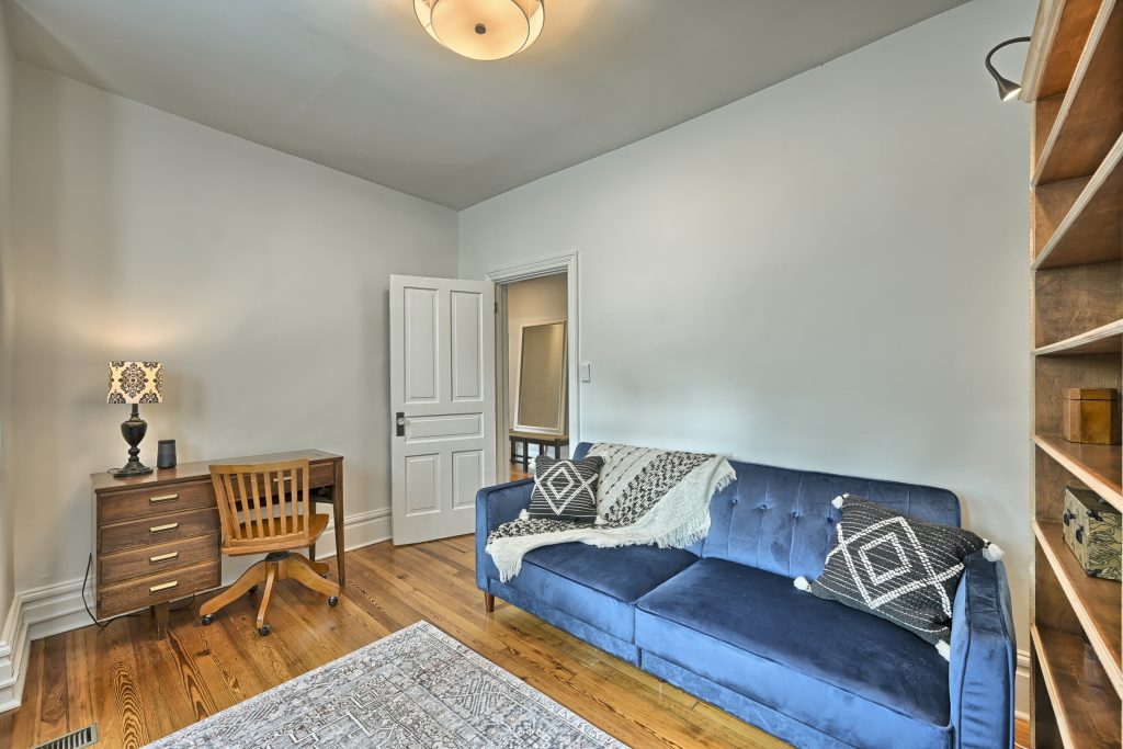 In the center of the 2nd floor, you’ll find the Library/Media Room with a large 50″ (127 cm) Smart TV. Gamers will be glad to hear that an Xbox One X, with controllers, and a selection of games are connected to this display. A tall bookcase contains a large selection of books. And finally, a work desk adorns one wall with an HDMI connected monitor and B&W laser printer/copier.