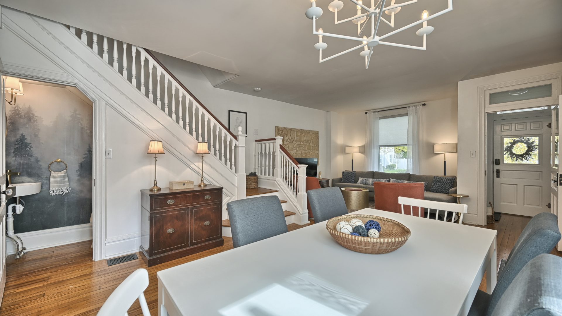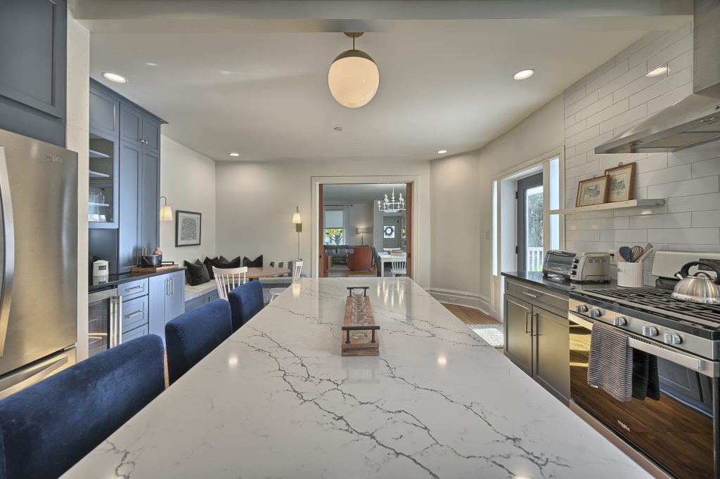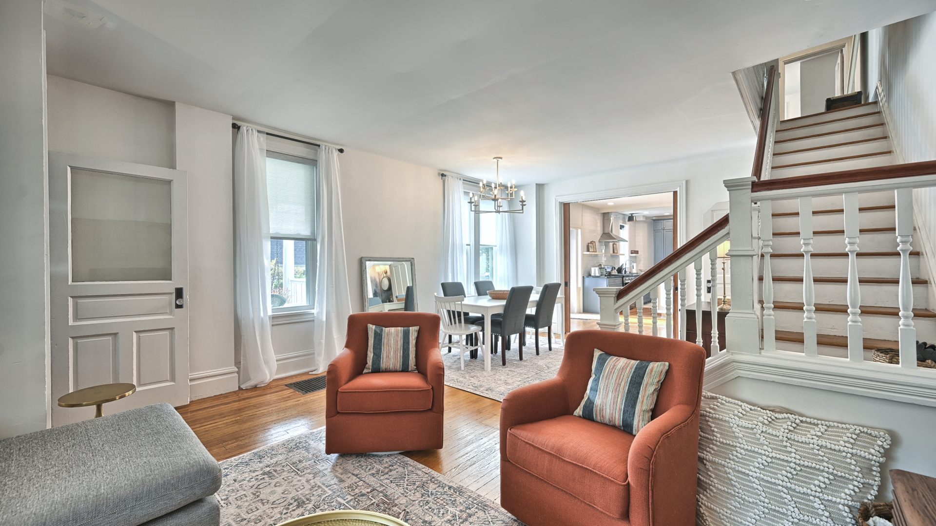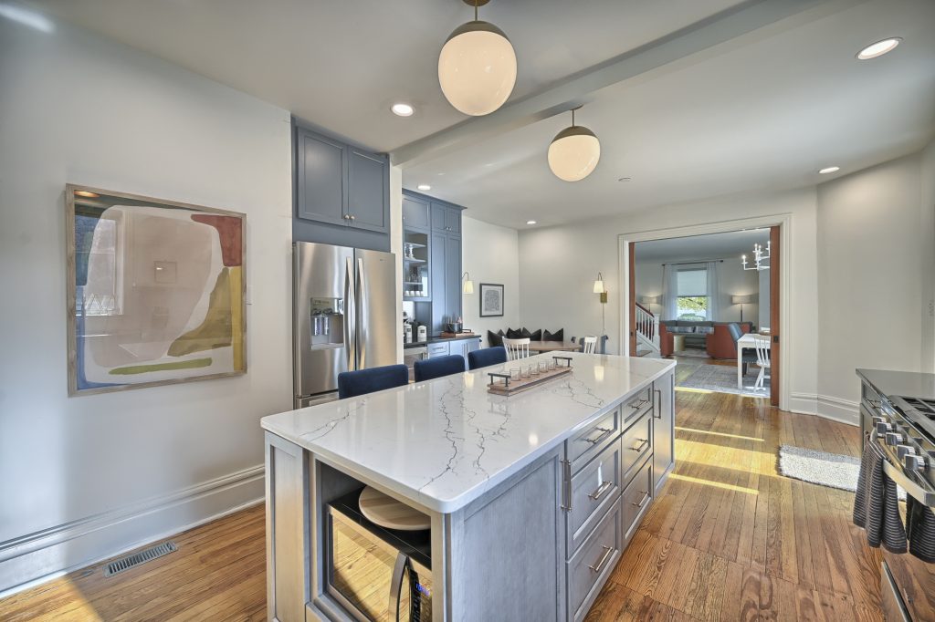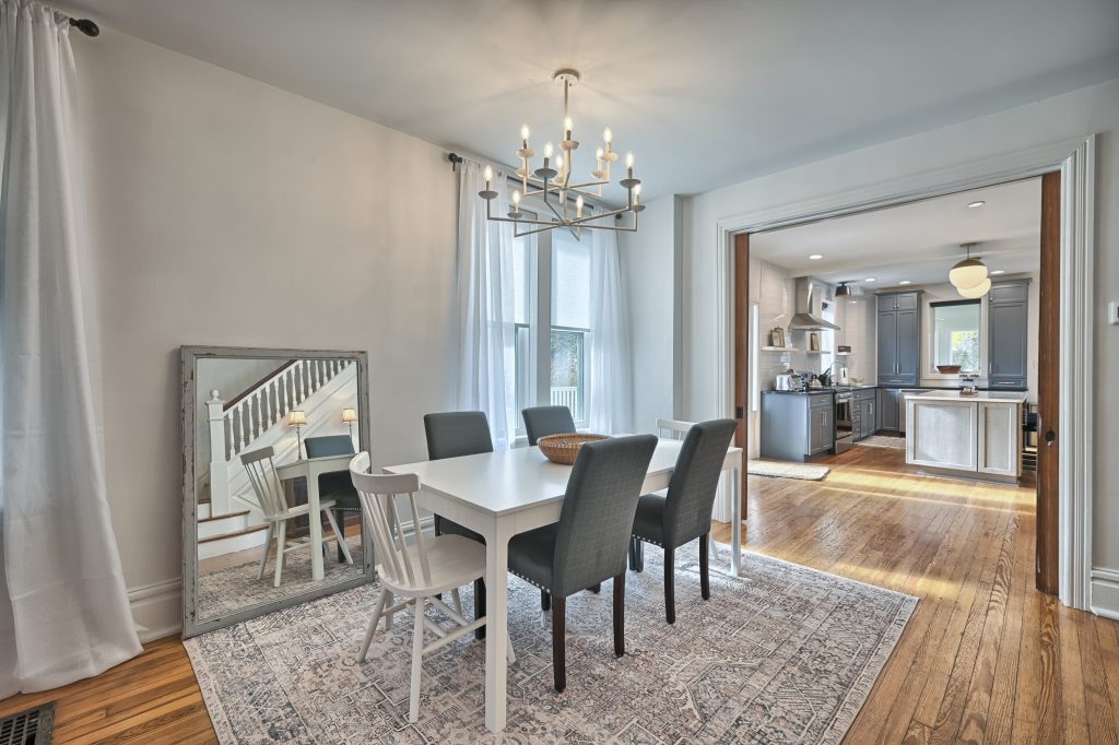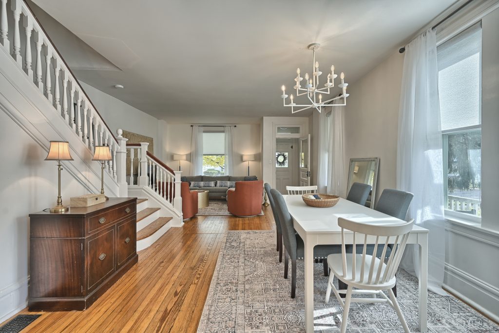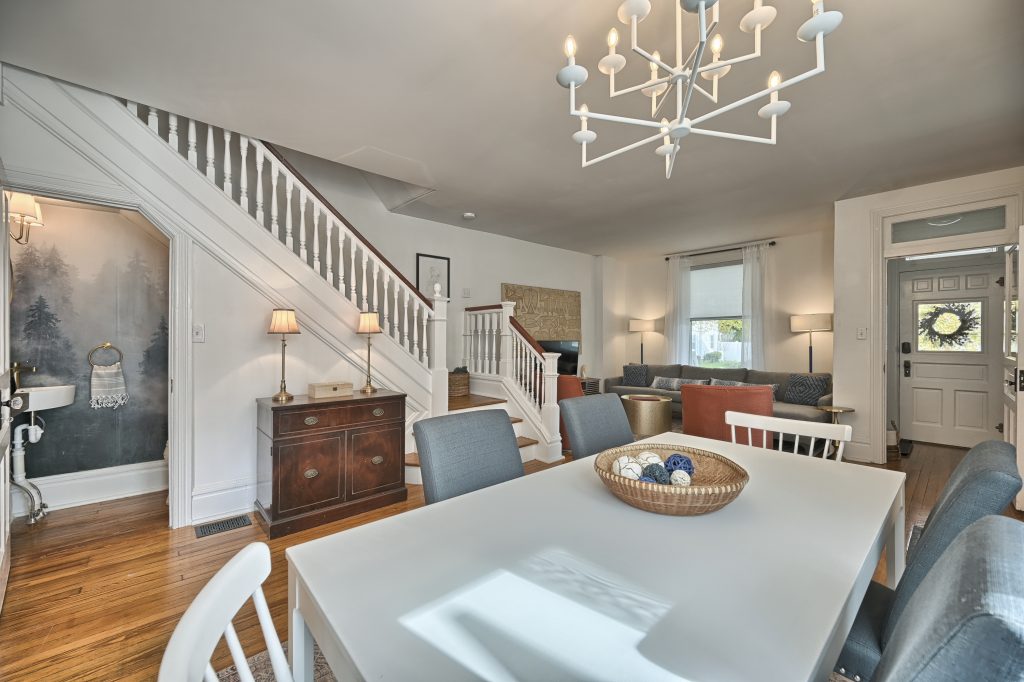 Enter through the front door of this nearly 100-year home and be presented with a beautiful open, living room, dining room, and kitchen.