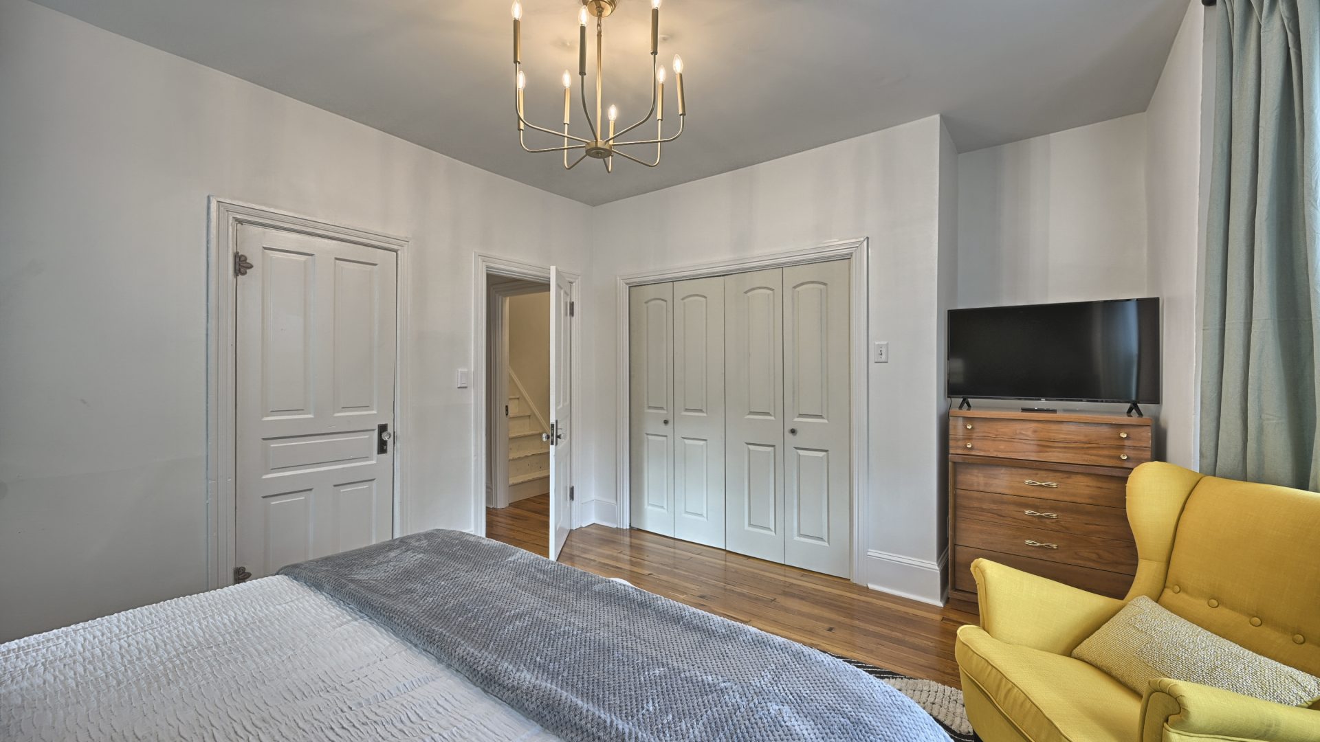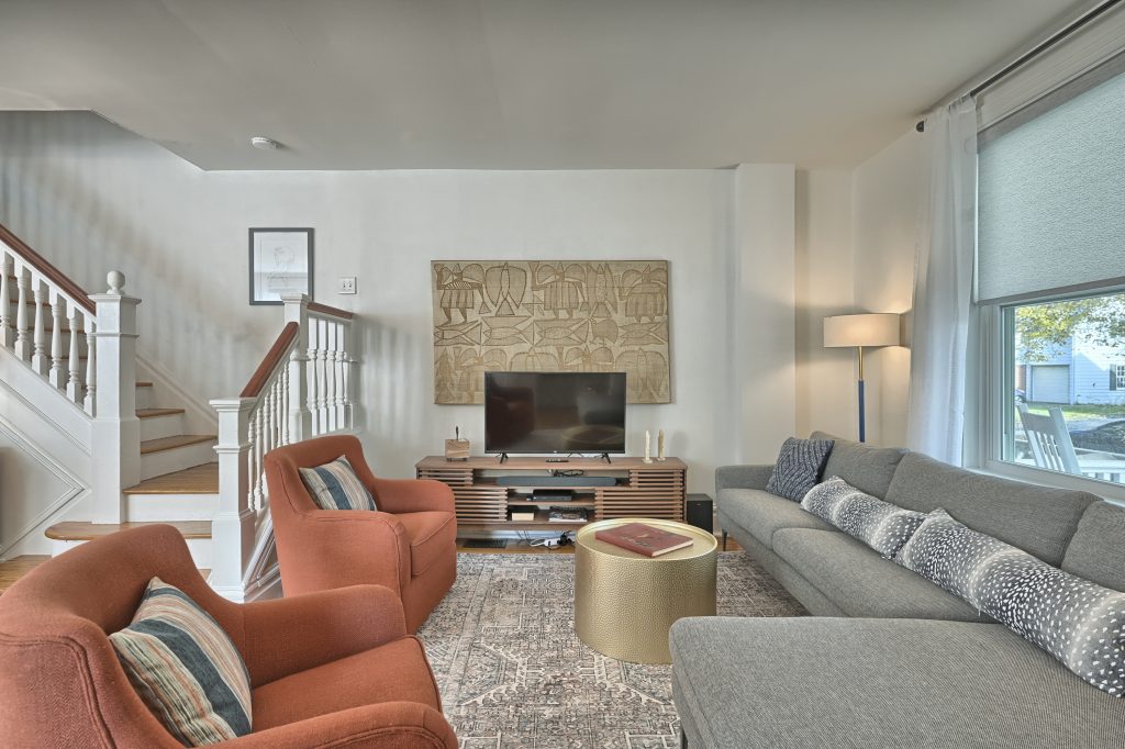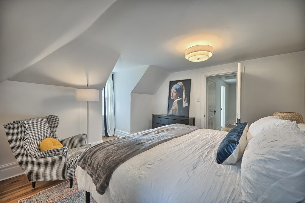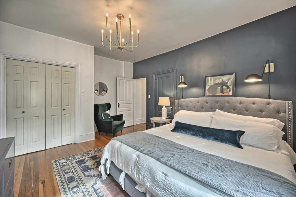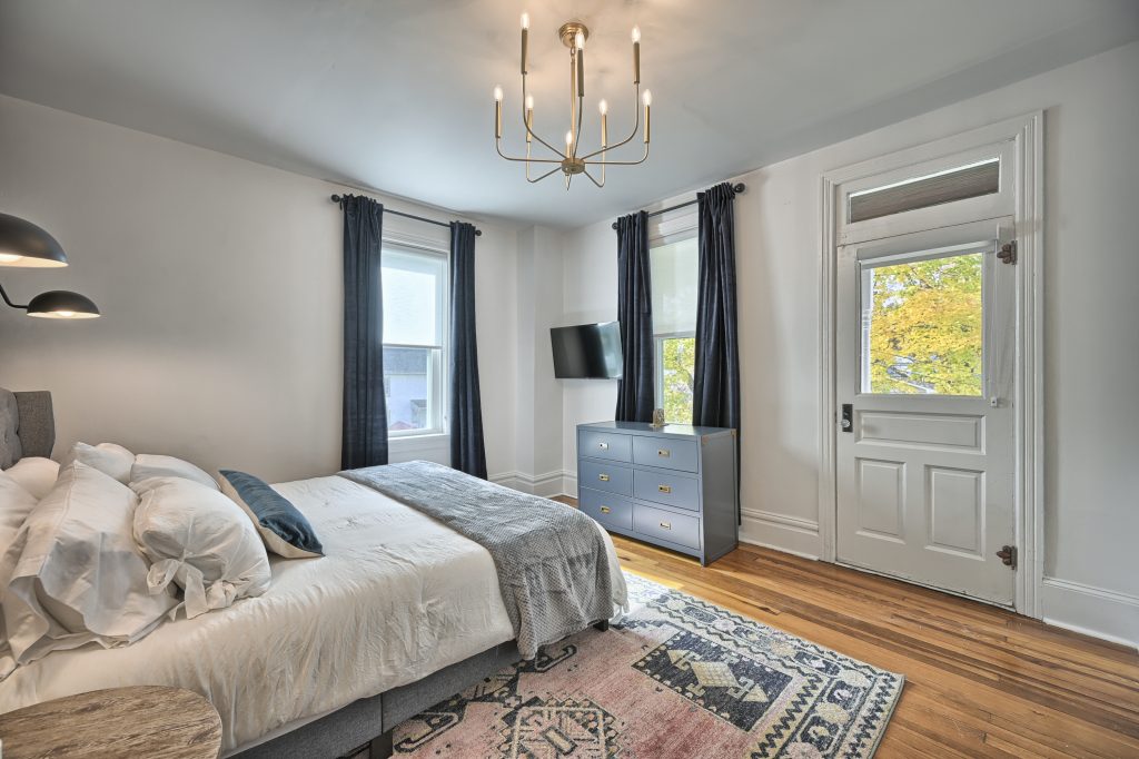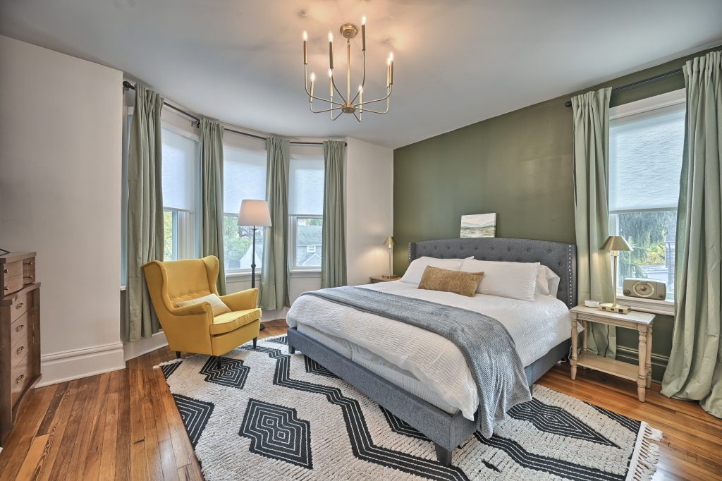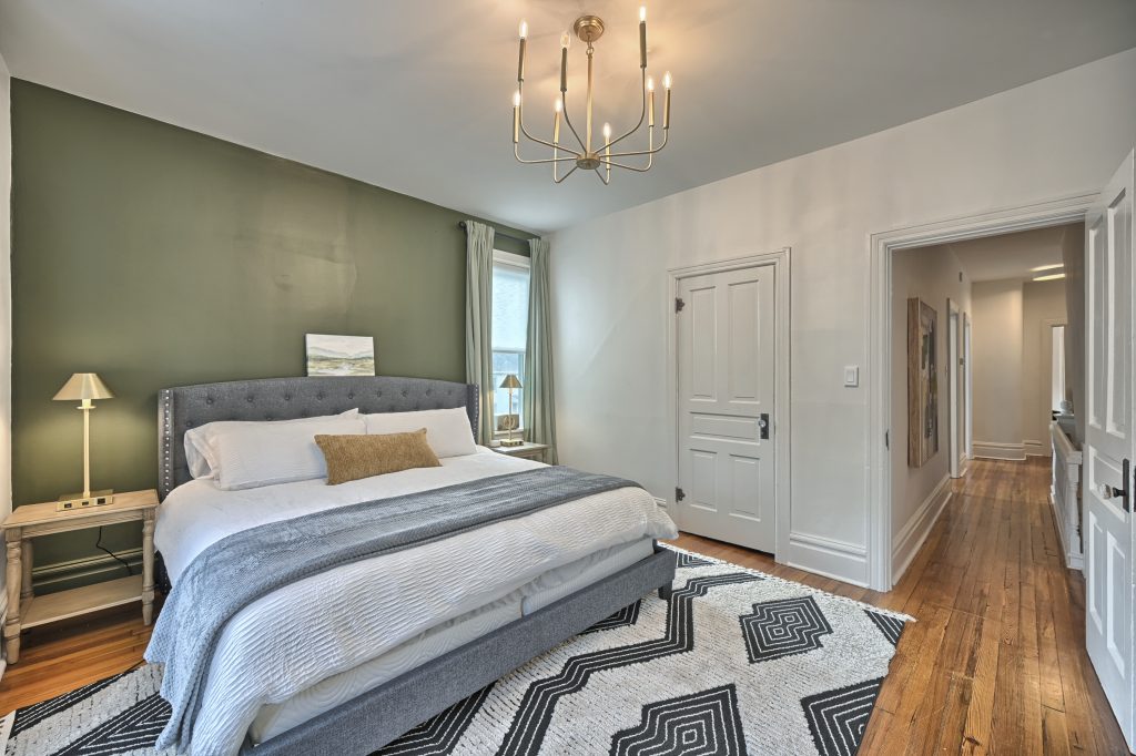 The “Green Room” also features a king-sized bed, top of the line linens and comfortable mattress with soft and firm pillows. This large bedroom is also equipped with a Smart TV for streaming.