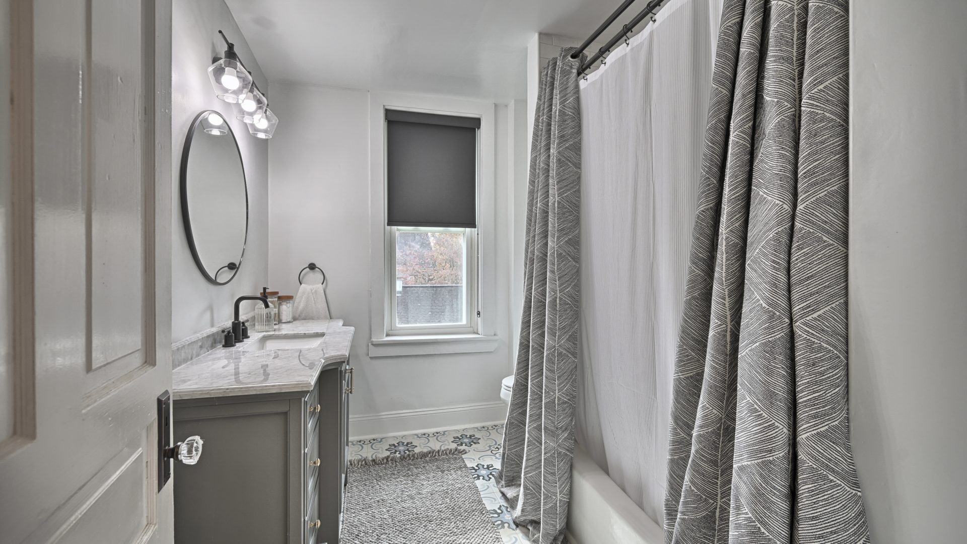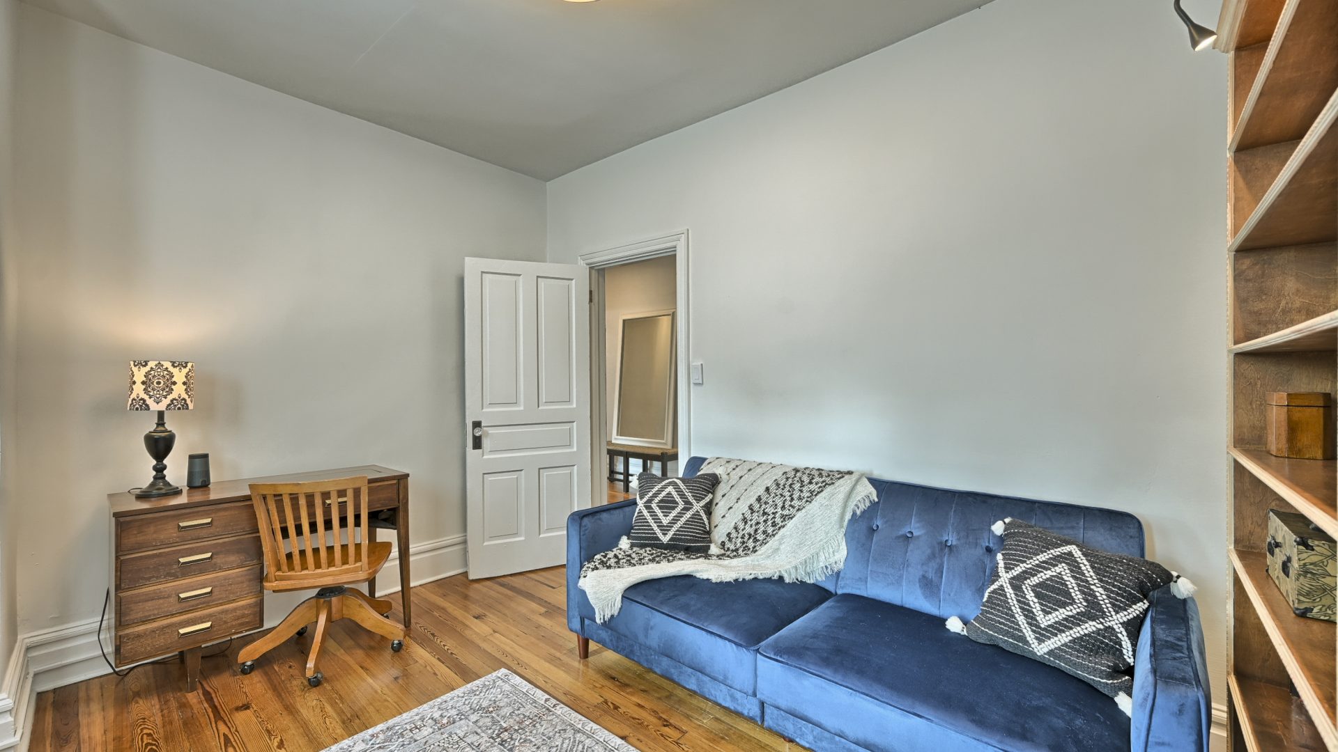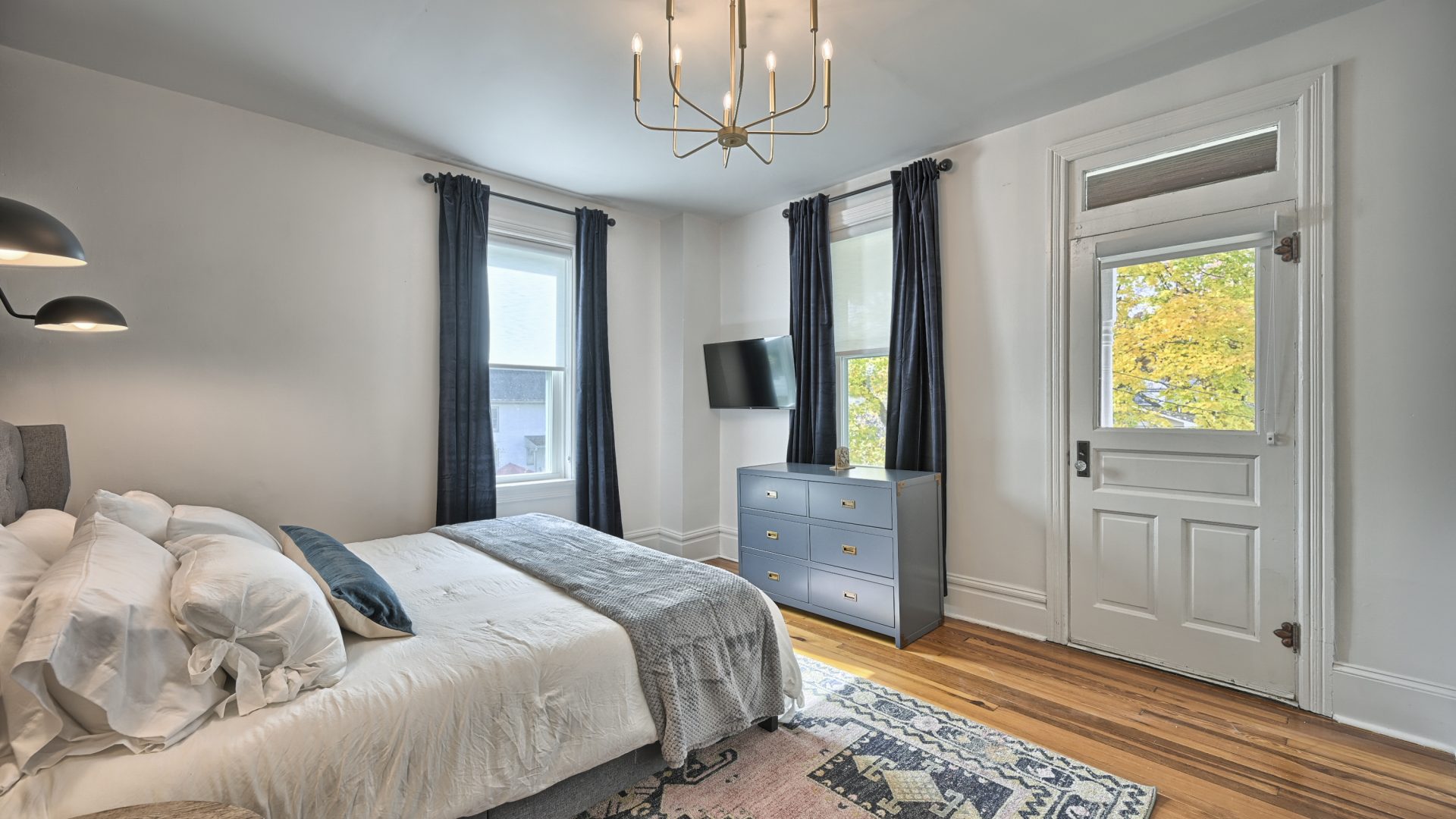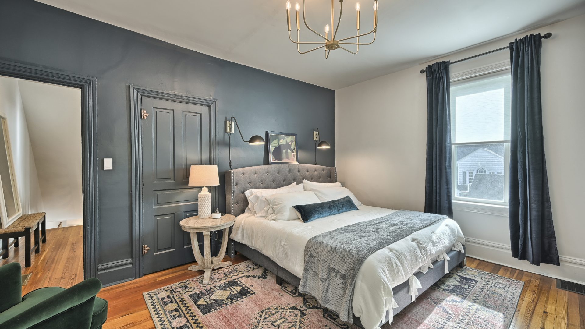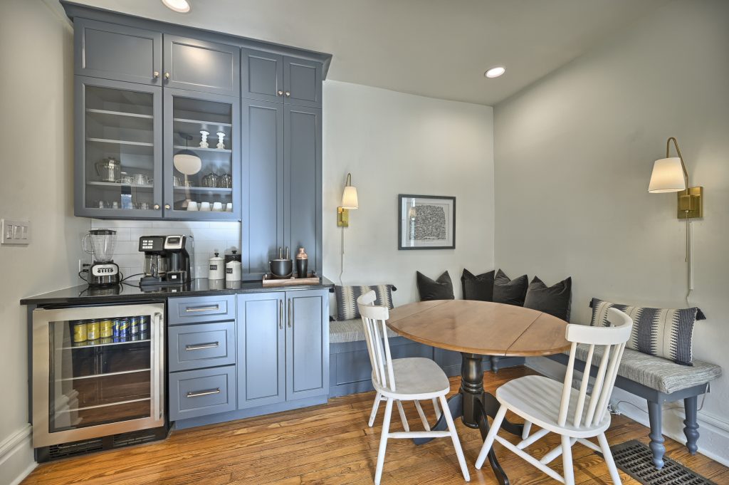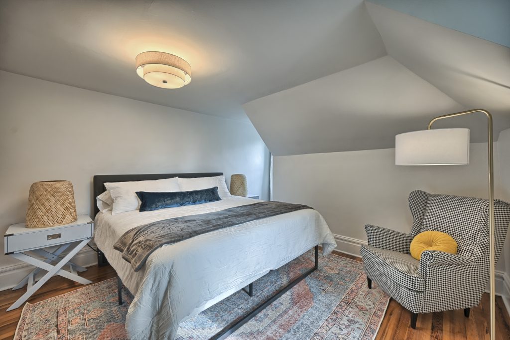 The “Blue Room” features a king-sized bed, top of the line linens and extraordinarily comfortable mattress and pillows. In the room you’ll find a wall mounted Smart TV for streaming your favorite entertainment. Also, for extra peace and tranquility, step outside to your own private deck overlooking the back yard.