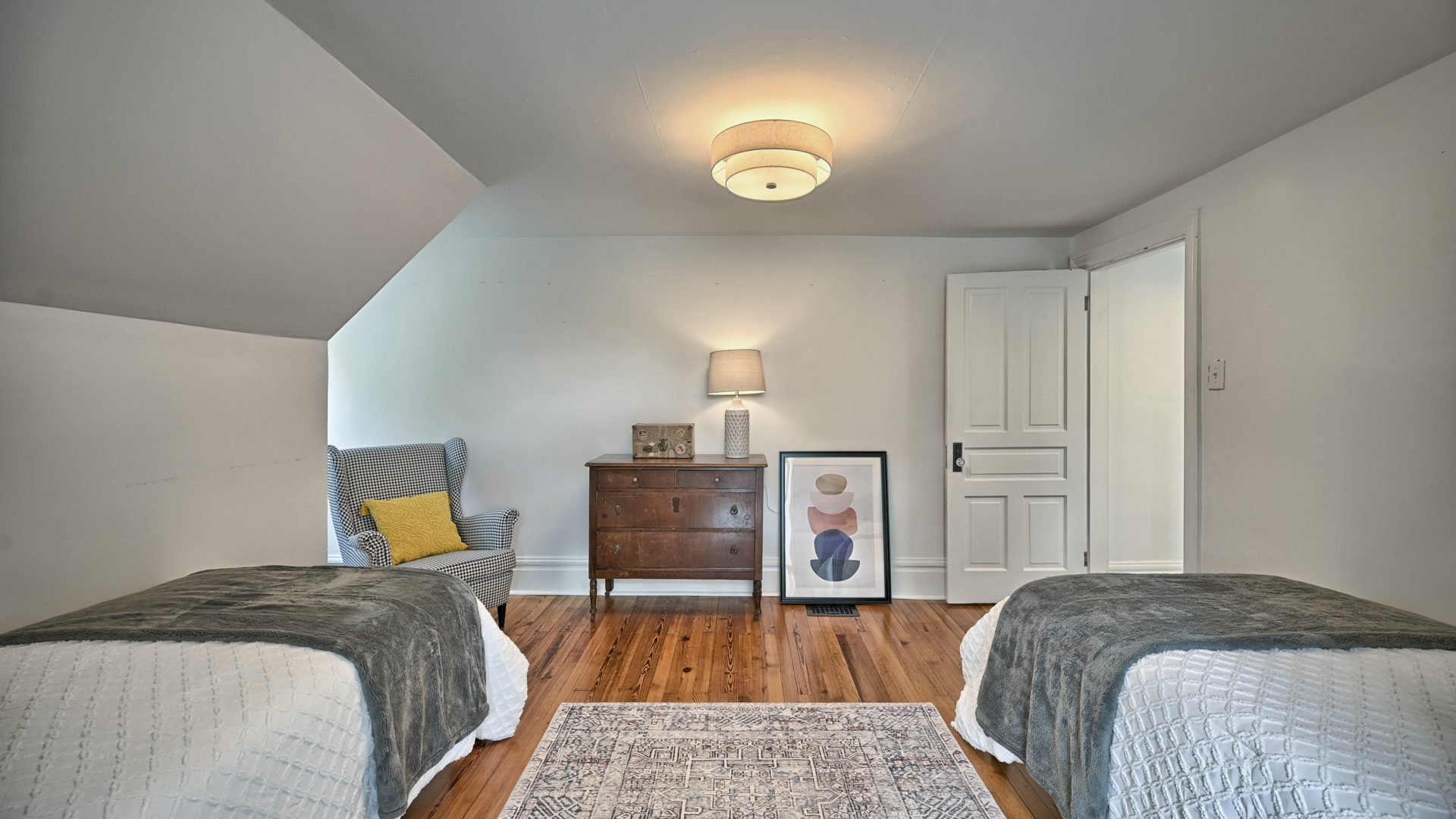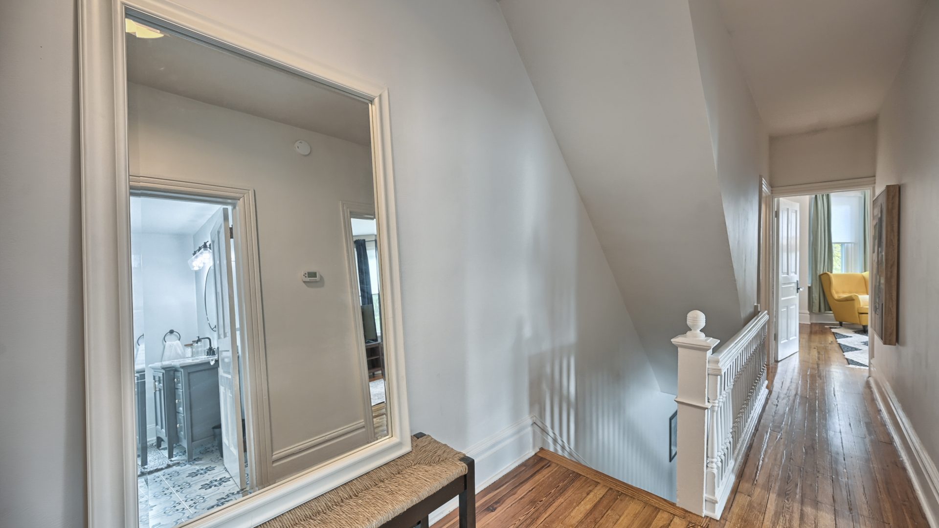 Head up the stairs to the second floor. You’ll find two large bedrooms: