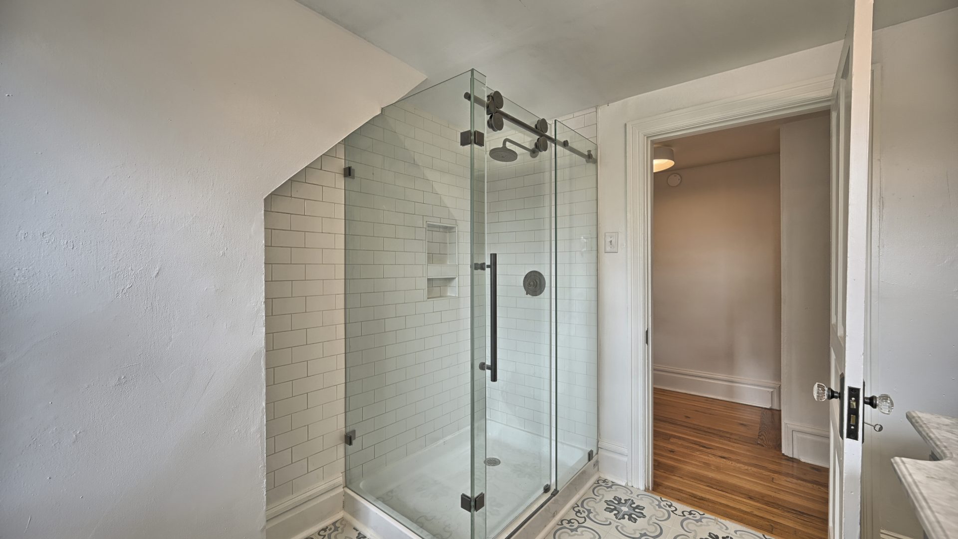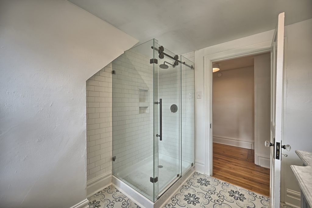 Rounding out the top floor is yet another full-sized bathroom with glass shower enclosure and full complement of linens and toiletries.