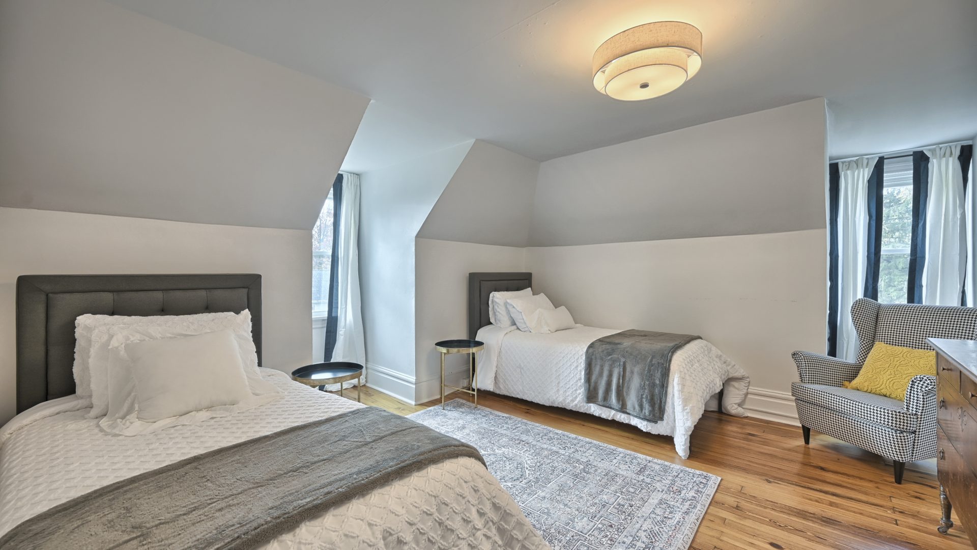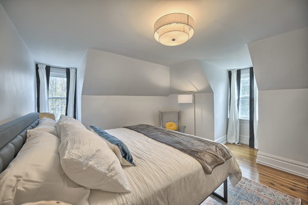 Head up to the top floor and you’ll find yet another two large bedrooms. One is equipped with king- sized bed, soft mattress and pillows. This bedroom also contains a large Smart TV for streaming.